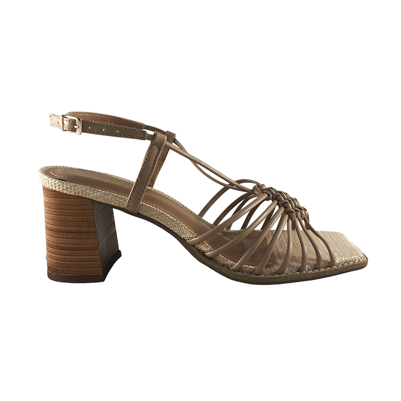 Sandália salto bloco, possui bico quadrado. Apresenta tiras sobre o peito do pé com detalhes em nó no centro. Um par de tiras adicionais se conecta harmoniosamente às principais, envolvendo o tornozelo com ajuste seguro e fechamento em fivela lateral. O solado, enriquecido por uma textura refinada, adiciona um toque de estilo e personalidade ao design.