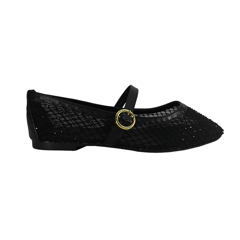 Sapatilha boneca, apresenta bico arredondado. Fechada, traz recorte arredondado no cabedal para um encaixe perfeito, e uma tira na parte superior com fechamento em fivela lateral. O acabamento em tela com aplicação de strass adiciona um brilho elegante, elevando qualquer produção com charme e sofisticação.