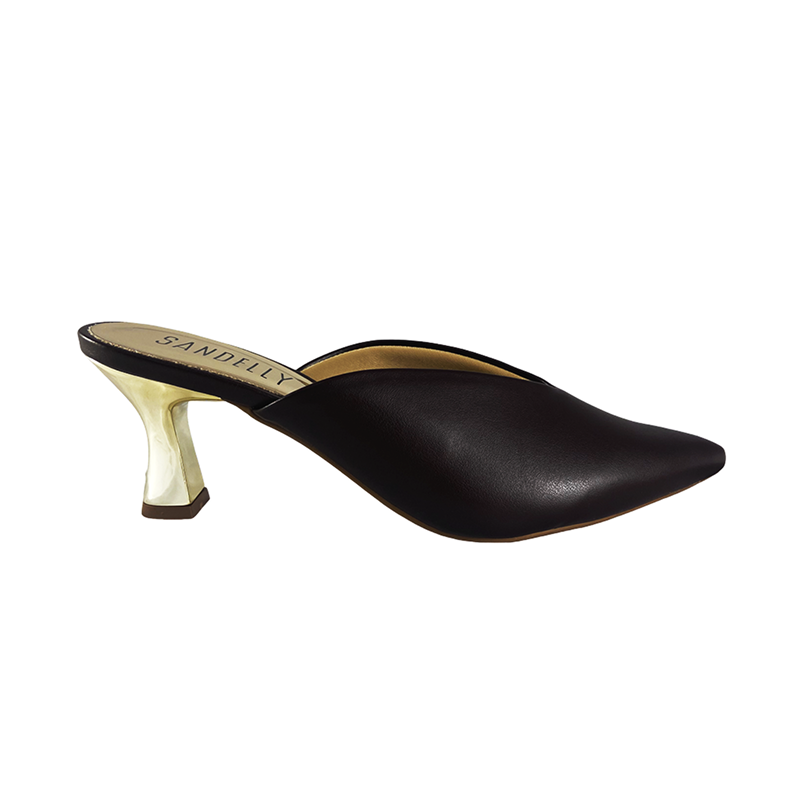 Mule com salto baixo e bico fino. Com um elegante recorte em V no cabedal, este modelo valoriza o peito do pé e proporciona um efeito alongado à silhueta. O toque de sofisticação fica por conta do salto com acabamento metalizado, que adiciona um brilho sutil e moderno à composição.