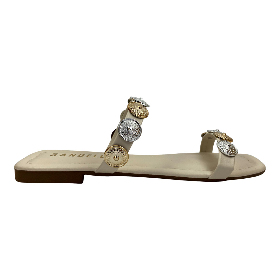 Delicada, marcante e cheia de personalidade, esta rasteira traz um design que ilumina qualquer produção. Suas tiras possuem apliques metalizados em duas tonalidades que criam um visual moderno e sofisticado, valorizando cada detalhe. Confortável e versátil, é a escolha perfeita para quem deseja um toque de brilho elegante no dia a dia ou em ocasiões especiais.