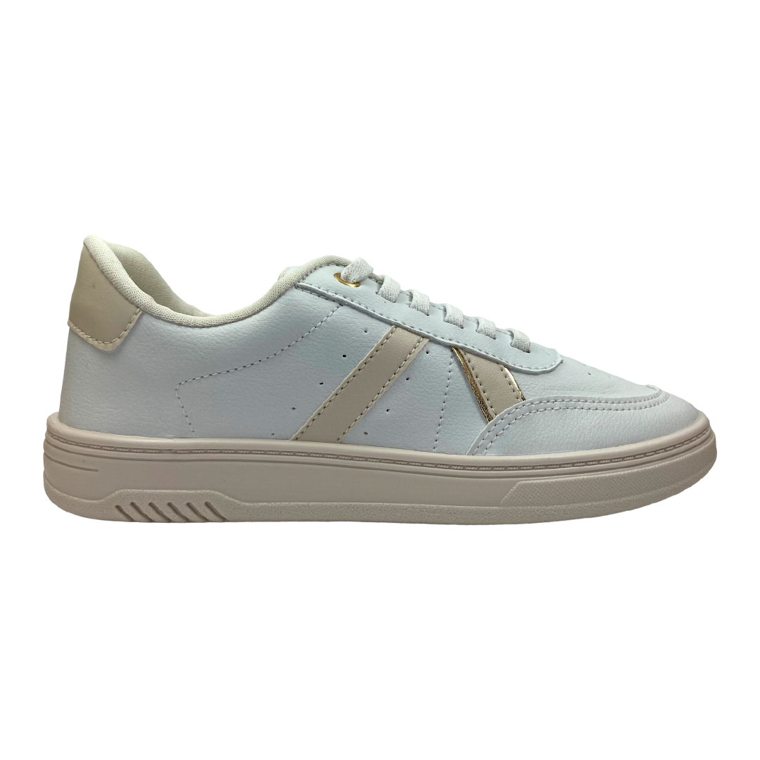 Moderno e cheio de personalidade, este tênis feminino combina design clean com detalhes que fazem a diferença. As duas faixas laterais formam um elegante V invertido, sendo uma delas com acabamento dourado que adiciona um toque de sofisticação ao visual. Os ilhoses dourados na parte superior reforçam o charme do modelo, enquanto os pequenos furos na parte frontal garantem leveza e um visual urbano atual. Versátil e confortável, é a escolha perfeita para quem busca praticidade no dia a dia sem abrir mão do estilo.