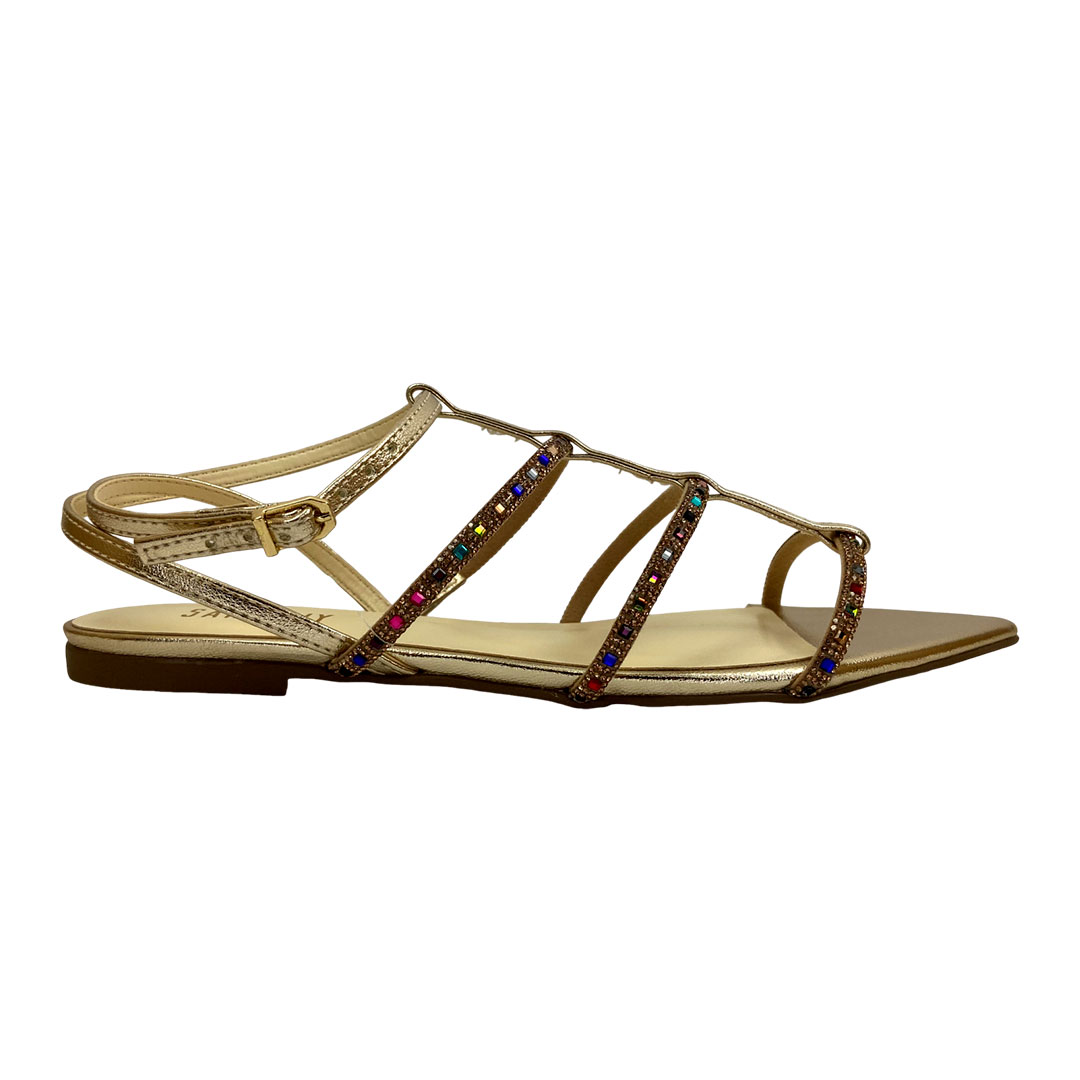 Delicada, marcante e cheia de personalidade, essa rasteira combina o charme do dourado com o brilho vibrante das aplicações coloridas. Suas múltiplas tiras finas realçam os pés com elegância, enquanto a ponta levemente afinada traz um toque moderno e sofisticado ao visual. Leve e confortável, é a escolha perfeita para iluminar looks do dia a dia, composições festivas ou produções descontraídas com um toque de glamour. Ideal para quem ama brilhar em grande estilo!