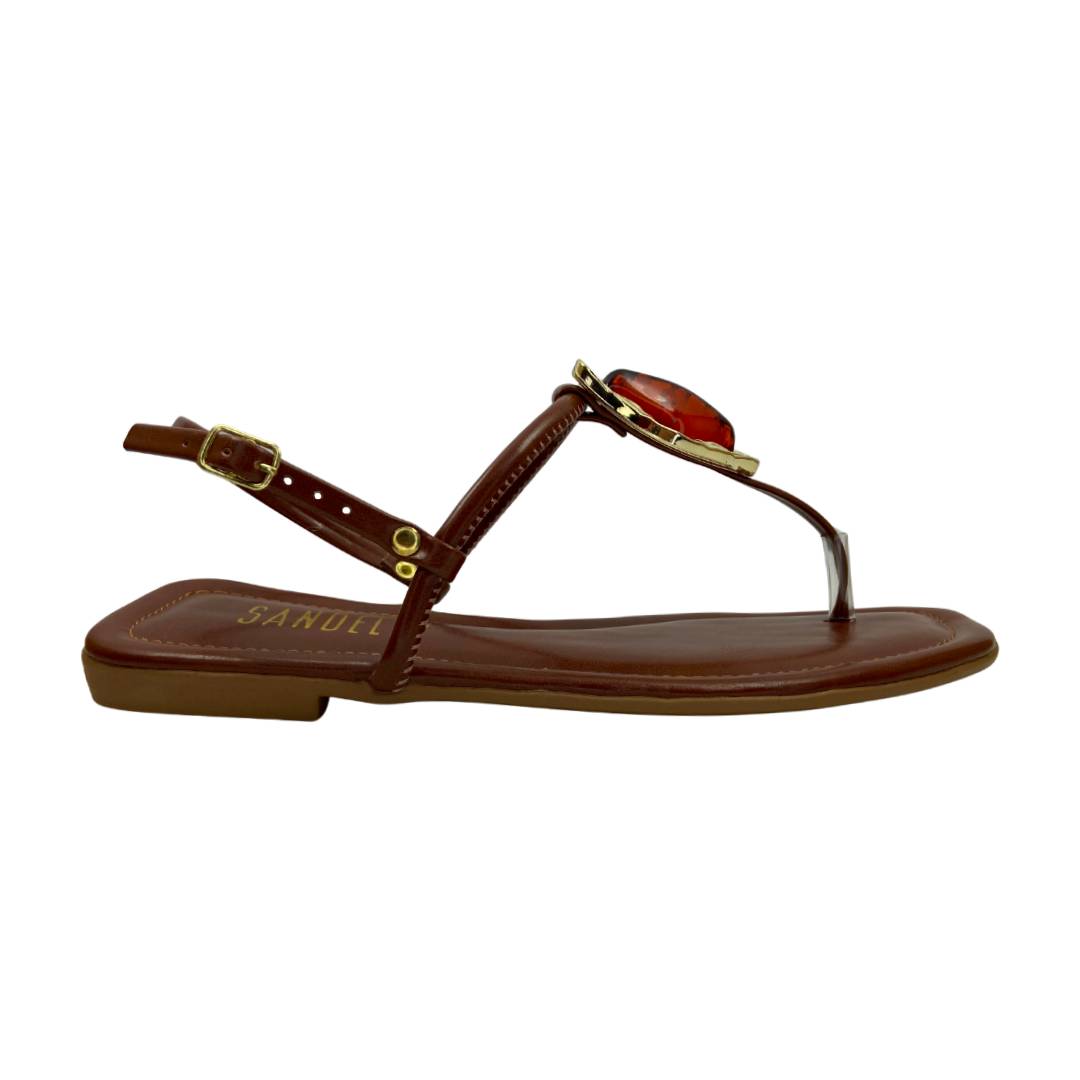 Sandália rasteira com estrutura slim. O modelo possui sola flat e bico quadrado suave, que confere um toque moderno ao visual. Traz tira fina que passa entre os dedos e segue até o centro do peito do pé, onde se conecta a um aplique em formato orgânico. O aplique apresenta contorno dourado texturizado e pedra em tom translúcido, criando um ponto de destaque elegante e sofisticado. A sandália conta ainda com tira fina que envolve o calcanhar e fechamento em fivela lateral metálica, permitindo ajuste seguro. O modelo garante conforto e delicadeza ao caminhar. Aberta e minimalista, é uma opção versátil para looks diários, produções leves de verão e combinações que pedem um toque de brilho sutil.