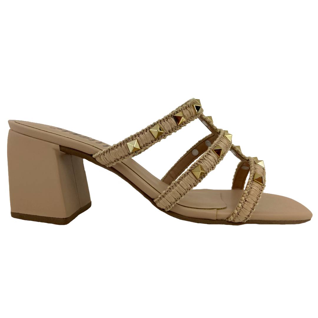 Tamanco, possui salto geométrico e bico quadrado. Traz tiras sobre os dedos e todo o peito do pé  com aplicação de tachas.