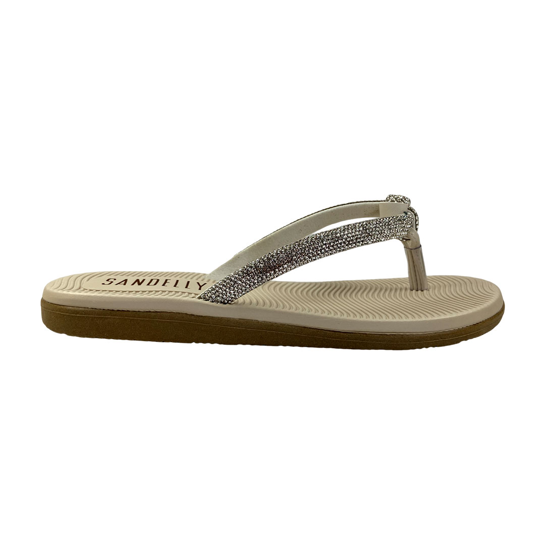 Rasteira, apresenta bico redondo. Traz tiras finas, dividindo os dedos, com aplicação de strass, exibe todo o pé.