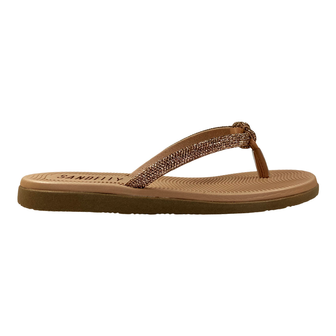 Rasteira, apresenta bico redondo. Traz tiras finas, dividindo os dedos, com aplicação de strass, exibe todo o pé.