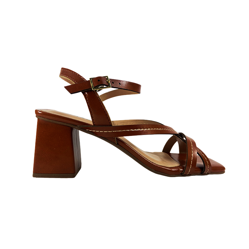 Sandália salto bloco, apresenta bico quadrado. Possui tiras cruzadas em X sobre o peito do pé, destacadas por delicada costura pespontada que valoriza o acabamento. Conta ainda com tira extra ao redor do tornozelo, com fechamento em fivela lateral que garante ajuste seguro e estiloso.