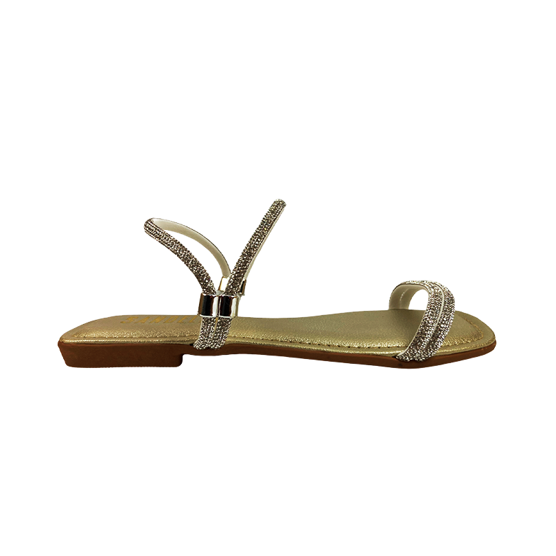 Sandália rasteira, possui bico quadrado. Apresenta um par de tiras com aplicação em strass sobre os dedos, mais duas tiras extras, igualmente adornadas com brilho, ao redor do tornozelo com ajustes metalizados nas laterais.