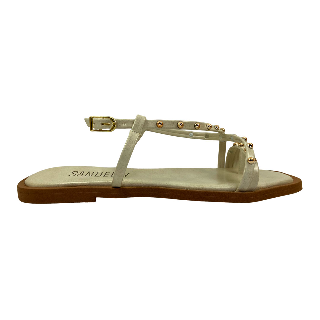 (M144) Sandália Rasteira Esferas Metalizadas Detalhe Pedraria Off White