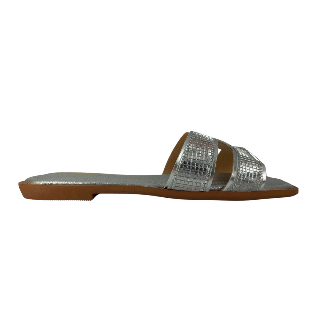 Rasteira com design moderno, possui bico quadrado e uma tira larga sobre o peito do pé, em formato de H. Seu acabamento metalizado com textura quadriculada adiciona um toque de brilho, perfeito para elevar qualquer look. Versátil e estilosa, essa sandália é ideal para compor desde produções casuais até combinações mais elegantes.