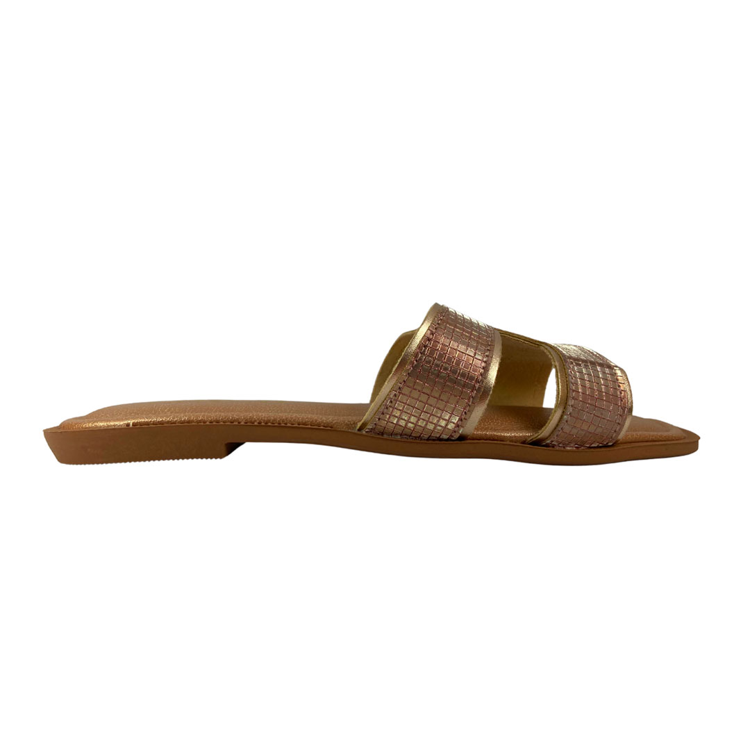 Rasteira com design moderno, possui bico quadrado e uma tira larga sobre o peito do pé, em formato de H. Seu acabamento metalizado com textura quadriculada adiciona um toque de brilho, perfeito para elevar qualquer look. Versátil e estilosa, essa sandália é ideal para compor desde produções casuais até combinações mais elegantes.