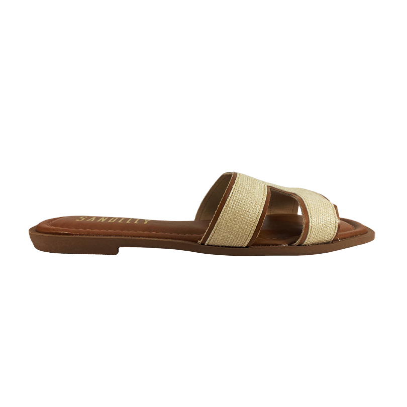 Sandália rasteira, possui bico arredondado. Apresenta tira larga em formato H sobre o peito do pé, com delicada aplicação de textura em palha, que traz um ar rústico e sofisticado à composição. Sem amarrações, garante praticidade no calce e conforto para o dia a dia.