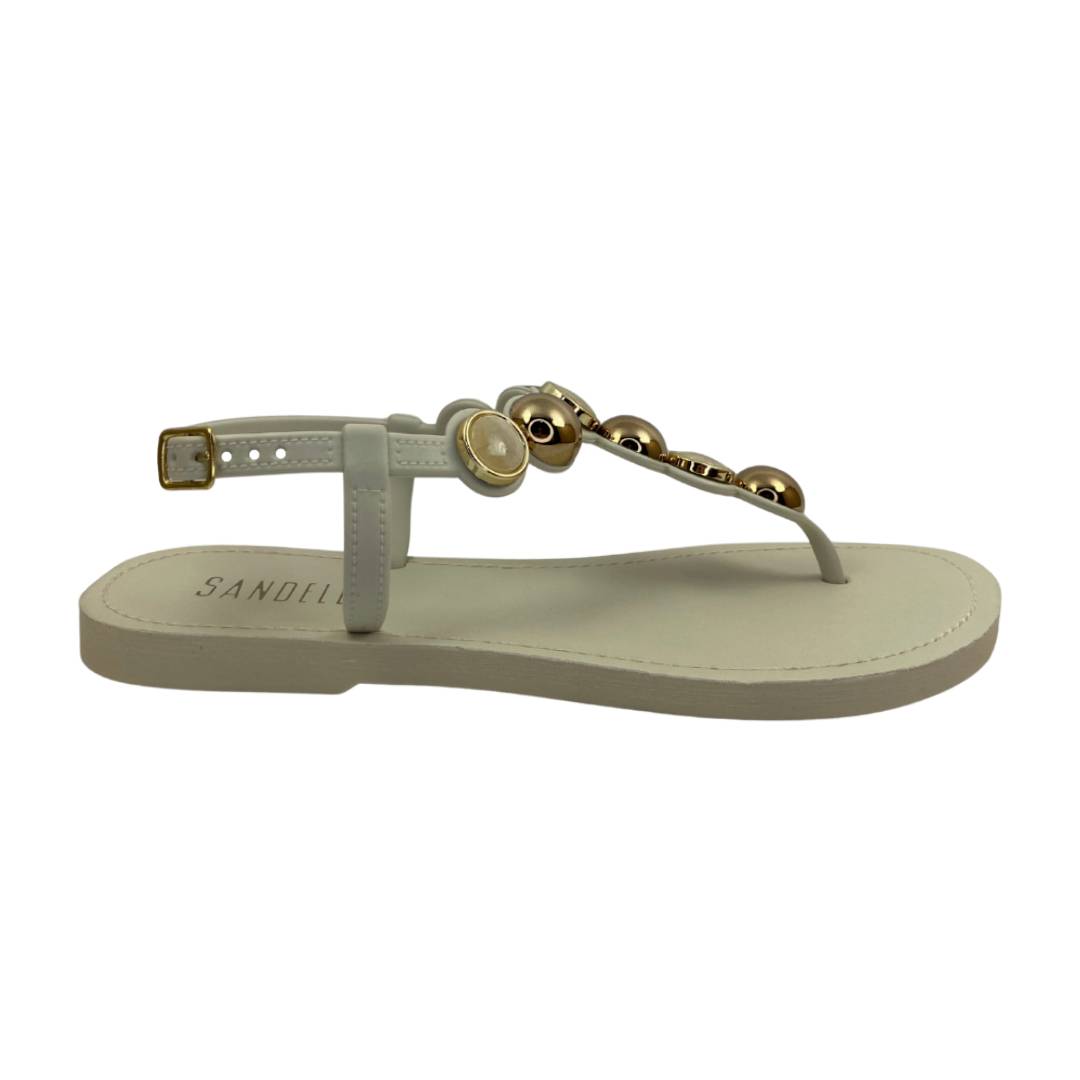Sandália rasteira, com design elegante e detalhes que valorizam o visual. O modelo possui tiras que dividem os dedos e seguem até a parte superior do pé, criando uma composição delicada e moderna. As tiras recebem aplicações metalizadas em acabamento dourado, intercaladas com detalhes arredondados, que trazem sofisticação e um toque fashion ao modelo. A construção segue contornando o tornozelo, garantindo melhor ajuste, e conta com fecho em fivela metálica lateral, que facilita o calce e proporciona segurança. A palmilha lisa, com acabamento confortável, completa o modelo. Aberta, a sandália deixa o pé em evidência, sendo perfeita para produções leves e elegantes, do dia a dia ao passeio.