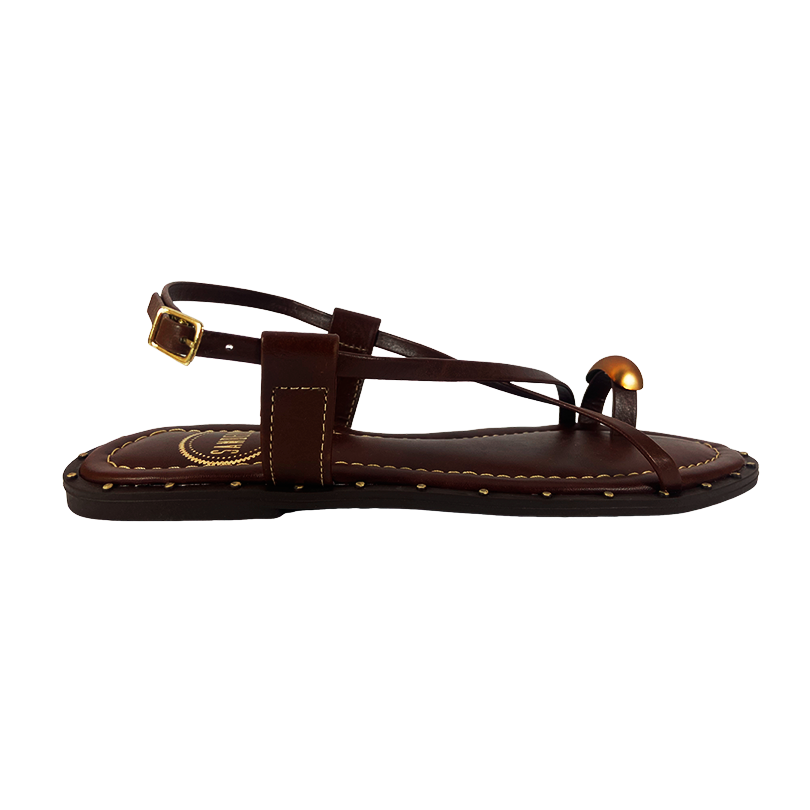 A sandália apresenta um design clássico com bico redondo e costuras pesponto por todo o contorno. Possui uma tira sobre o hálux, adornada com um detalhe metalizado, que acrescenta um toque de sofisticação. Tiras cruzadas sobre o peito do pé que seguem pelas laterais e contornam o calcanhar,com fecho em fivela metálica, sendo ligada a tiras laterais para apoio.